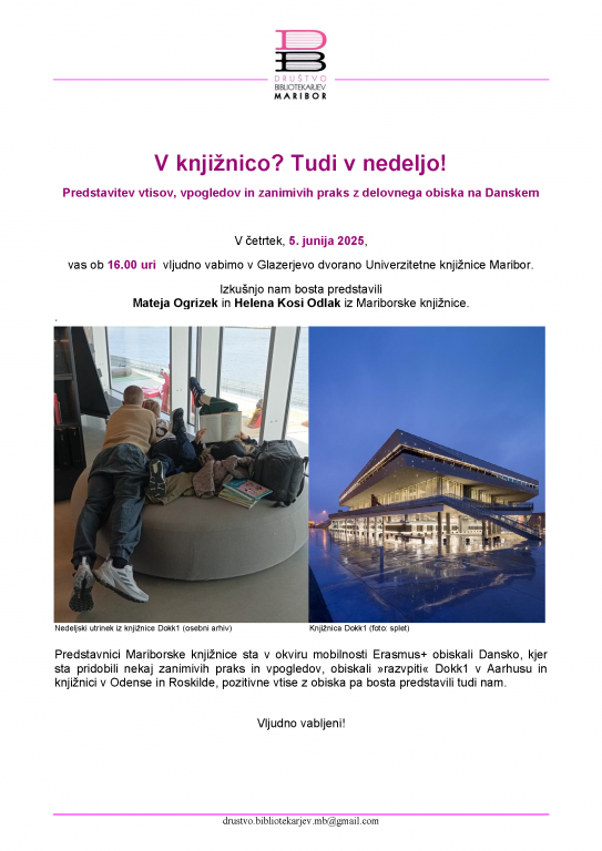 Spoštovane članice in člani, čeprav je jesen polna raznih dogodkov, smo že za konec leta tudi v DBM združili strokovni del in naš tradicionalni izlet v (ne)znano, ki smo ga tokrat pripravili v sodelovanju z DBC. V soboto, 30. 11. 2024, vas tako vljudno vabimo na strokovno ekskurzijo v Trst, z ogledom razstave slovenske ilustracije In kaj se je zgodilo potem? V priponki je celotno vabilo. Ne odlašajte in se prijavite do 10. 11. 2024 oz. do zasedbe mest preko spletne prijavnice.
